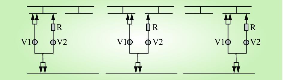 (3)真空滅弧型。機械式真空滅弧型有載調壓開關不同于傳統的絕緣油滅弧,分接頭切換在真空管中完成,不存在切換電弧造成油劣化和污染問題。機械式真空滅弧型有載調壓開關功能實現的關鍵是真空切換開關的選擇與過渡電路的設計,性能水平主要取決于真空觸點的切換參數,包括額定電流、額定電壓與額定容量。機械式真空有載調壓開關切換電路具體如圖3所示[16],R為過渡電阻,V1、V2為真空管。